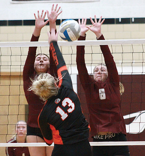 Staff photo by Travis Rosenau New Ulm Cathedral’s Sydnee Helget (left) and Lily Franta (6) block a spike from Cleveland’s Grayce Kortuem (13) on Thursday night at Cathedral High School.