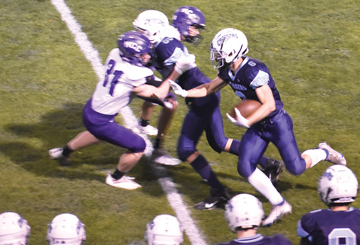 Staff photo by Jeremy Behnke Minnesota Valley Lutheran wide receiver Cole Thompson races down the sideline for a 58-yard touchdown during the first quarter in Friday’s game against Murray County Central at Johnson Field. MCC defeated MVL 30-6.