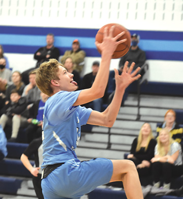 Staff photo by Jeremy Behnke Minnesota Valley Lutheran’s Ben Pearson goes up for a layup during Thursday’s game against Buffalo Lake-Hector-Stewart at MVL High School.