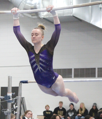 Staff photo by Travis Rosenau New Ulm’s Kayla Goblirsch competes on uneven bars during the Eagles’ home meet with Marshall on Monday at the New Ulm Recreation Center.