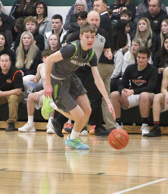 File photo by Travis Rosenau Sleepy Eye St. Marys’ Will Walter dribbles the ball during an earlier home game this year at St. Mary’s High School.