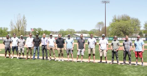 Staff photo by Travis Rosenau Members of New Ulm’s 2002 Class AAA state championship baseball team pose for a photo before New Ulm’s game with Red Wing on Saturday at Mueller Park. Those who attended and pictured in no particular order were Keith McClellan, Eric Austvold, Nate Carroll, Chris Cariveau, Pete Meier, Ty Anderson, Dusty Fleck, Matt Suess, Isaac Forstner, Bob Wellmann, Jace Marti, Joe Peters, Dusty Farasyn, Jamie Hoffmann and Blake Thorson. Those unable to attend were Dan Kitzberger, Brandon Rolloff, Kyle Marti; ‘Bat Boy’ Eric Curry; coaches Jim Senske, David Curry, Jim Schwarz and Dave Kunz.