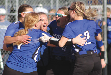 Staff photos by Travis Rosenau Members of the Nicollet softball team celebrate after Thursday’s Section 2A finals win over New Ulm Cathedral at Caswell Park in North Mankato.