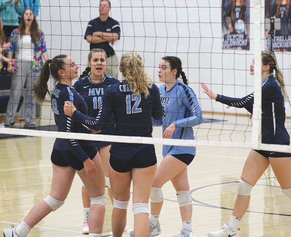 File photo by Travis Rosenau Minnesota Valley Lutheran players celebrate a kill during a home match this season. Pictured from left to right are Becca Kuck (10), Kerigan Brau (11), Mackenzie Merseth (12), Ella Hunter (5) and Gabbie Bleick (20).