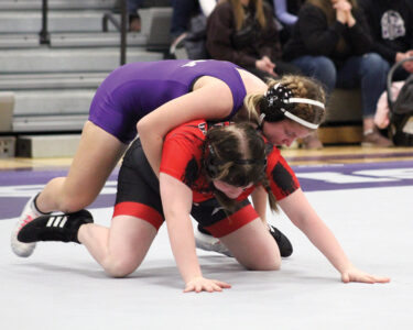 - Staff photo by Travis Rosenau New Ulm Area’s Ellie Dake, top, wrestles St. James Area’s Nevaeh Hanson Thursday during a girls varsity wrestling match, New Ulm High School’s first-ever girls match.
