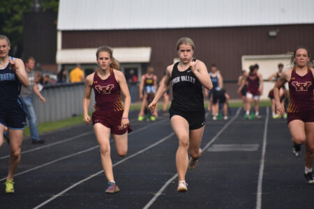 Staff photo by Fritz Busch River Valley junior Hailey Hollar, second from right, wins the girls 100-meter dash at the Tomahawk Conference Track Meet at Sleepy Eye Thursday. Hollar finished in 13.07 seconds. Others in the race from left are Averyelle Hopp of Minnesota Valley Lutheran, Katelyn Zeug and Madisyn Ourada of Wabasso.