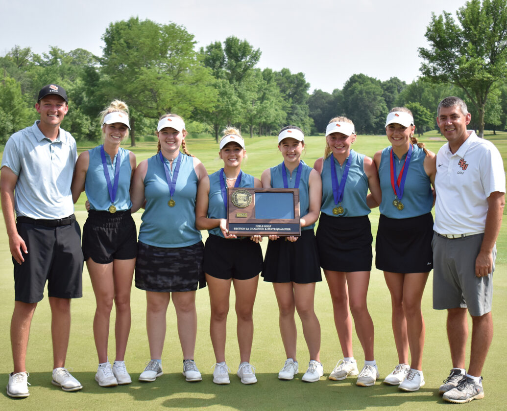 Staff photo by Ari Selvey The Sleepy Eye United girls golf team holds the plaque for the Section 2A Girls Golf Championship at North Links Golf Course in Makato. From left to right, Head Coach Bryant Mages, Jaci Domeier, Meriden Andres, Chloe Walter, Kiara Murphy, Sam Price, Liz Schwint, and Assistant Coach George Schwint.