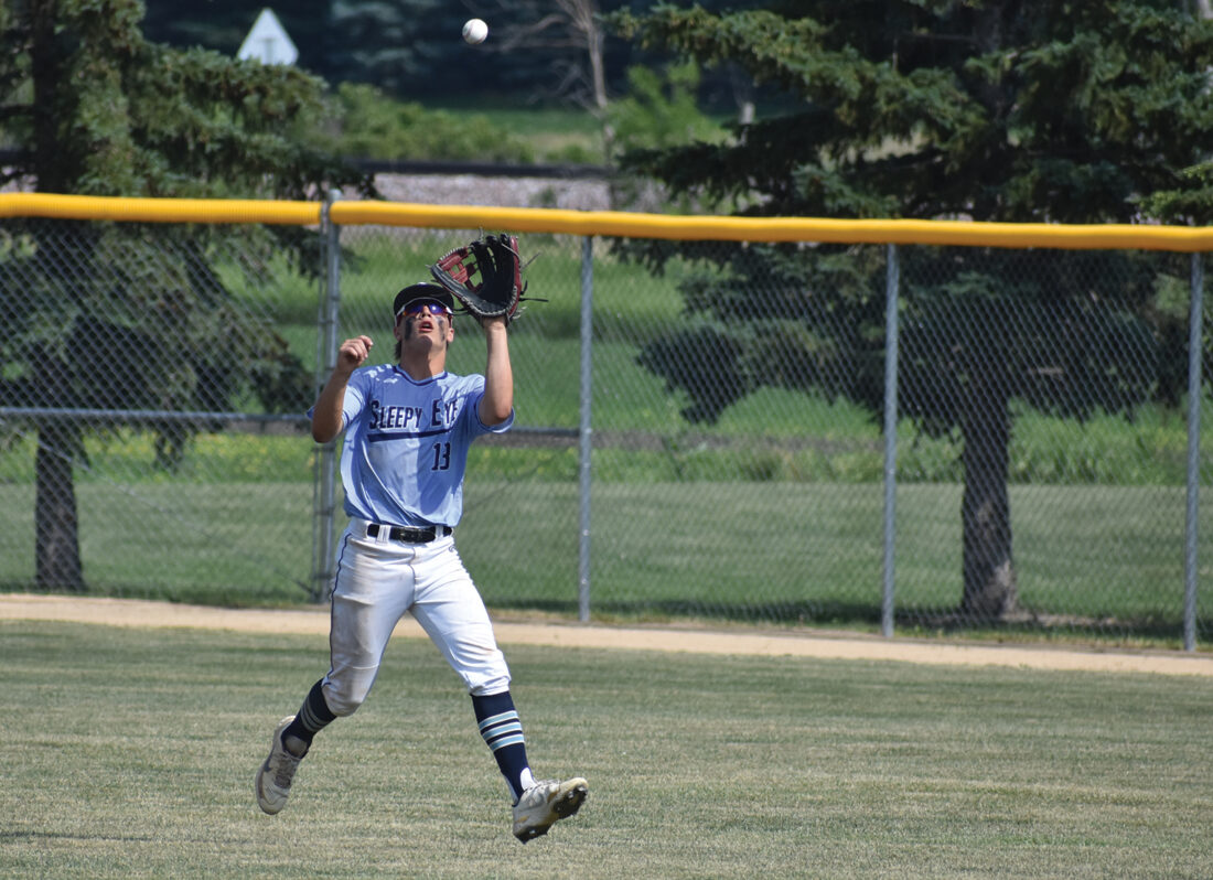 Staff photo by Ari Selvey Sleepy Eye Junior Legion’s Jon Petermann fields a fly ball during a Junior Upper Midwest Classic baseball game against Wayzata at Essig on Friday.