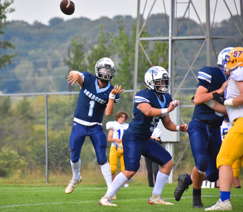 Staff photo by Ari Selvey Minnesota Valley Lutheran’s Kaden Peterson throws a pass during a South Central District, Silver Subdistrict football game Friday at Johnson Field.