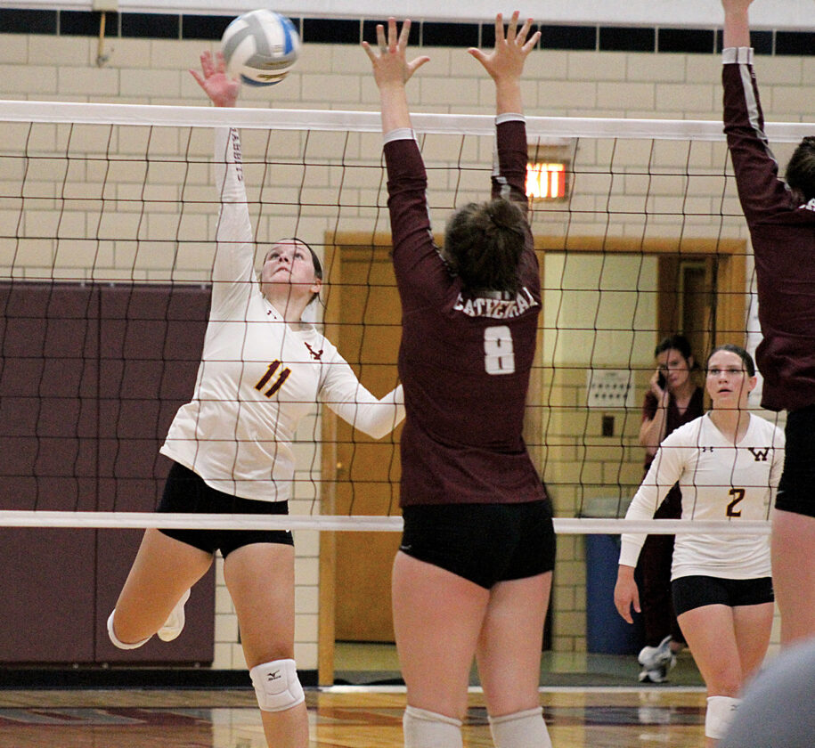 File photo by Travis Rosenau Wabasso’s Natasha Doubler (11) tries to hit the ball past a pair of New Ulm Cathedral players during a Sept. 14 Tomahawk Conference volleyball match at Cathedral High School.
