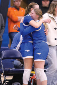 Photo courtesy of Kate Maiers From left to right, Buffalo Lake-Hector-Stewart’s Kristi Kottke hugs teammate Ellaina Bergstrom after subbing out late near the end of Saturday’s state third-place game at Gangelhoff Center in St. Paul.