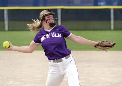 - Staff photo by Travis Rosenau New Ulm pitcher Ramsey Hopp winds up to deliver a pitch during the Section 2A Softball Tournament title game against Mankato East on Thursday at Caswell Park in North Mankato.