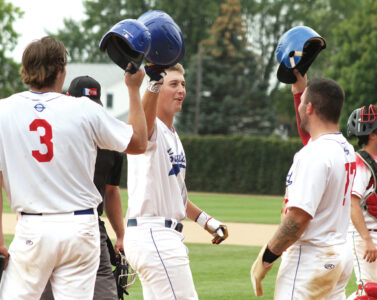 - Staff photo by Travis Rosenau Courtland Cubs’ Carter Lang (3) and Nolan Drill (77) greet Teddy Giefer (middle) at home plate after Giefer’s homer in the sixth inning of Sunday’s Class C Minnesota State Amateur Baseball Tournament second-round game against Isanti at Tiger Park in Belle Plaine.