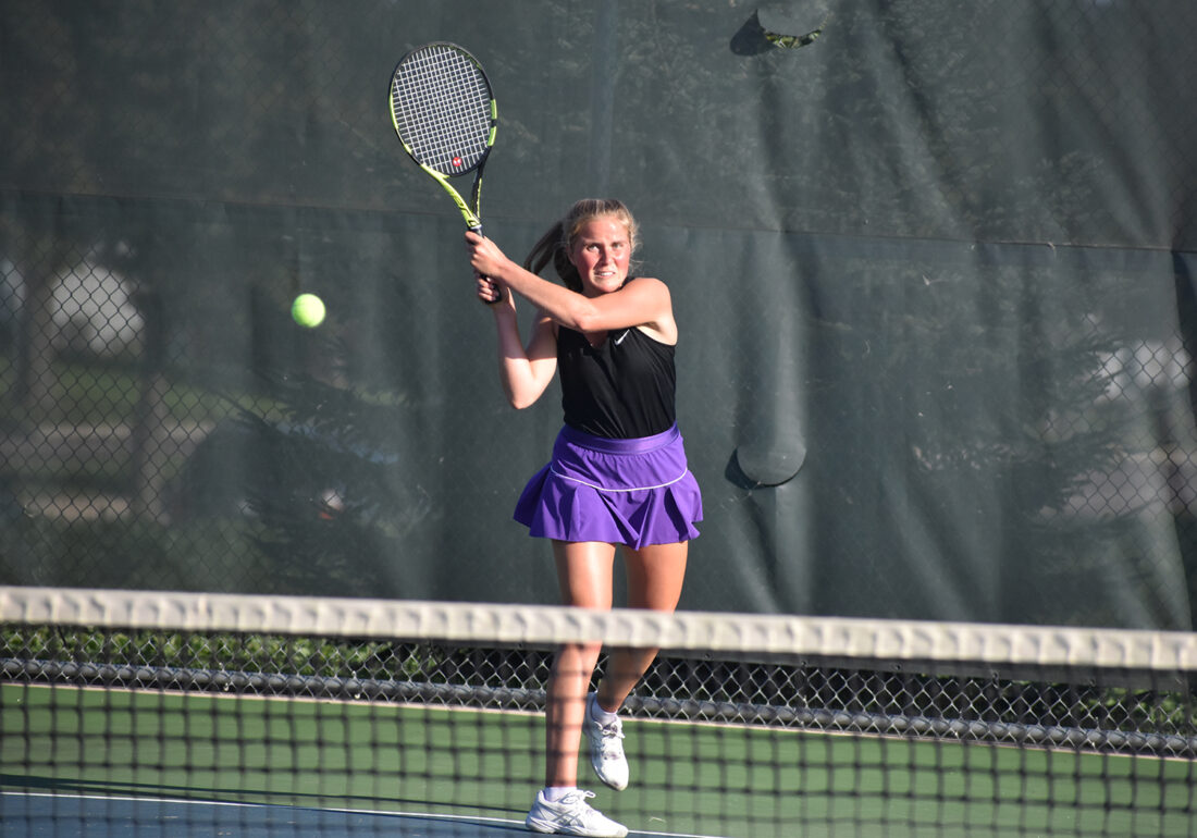 Staff photo by Ari Selvey New Ulm’s Karlee Prahl returns a volley at No. 1 singles during a Big South Conference girls tennis meet Tuesday at New Ulm High School