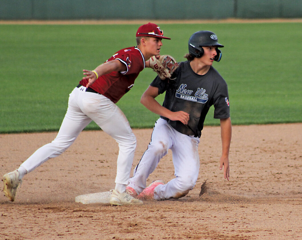 Staff photo by Travis Rosenau New Ulm VFW Silver’s Owen Castleman slides into second and is tagged by Fairmont Junior Legion’s Merritt Pomerenke as they await the call Thursday night at Mueller Park.