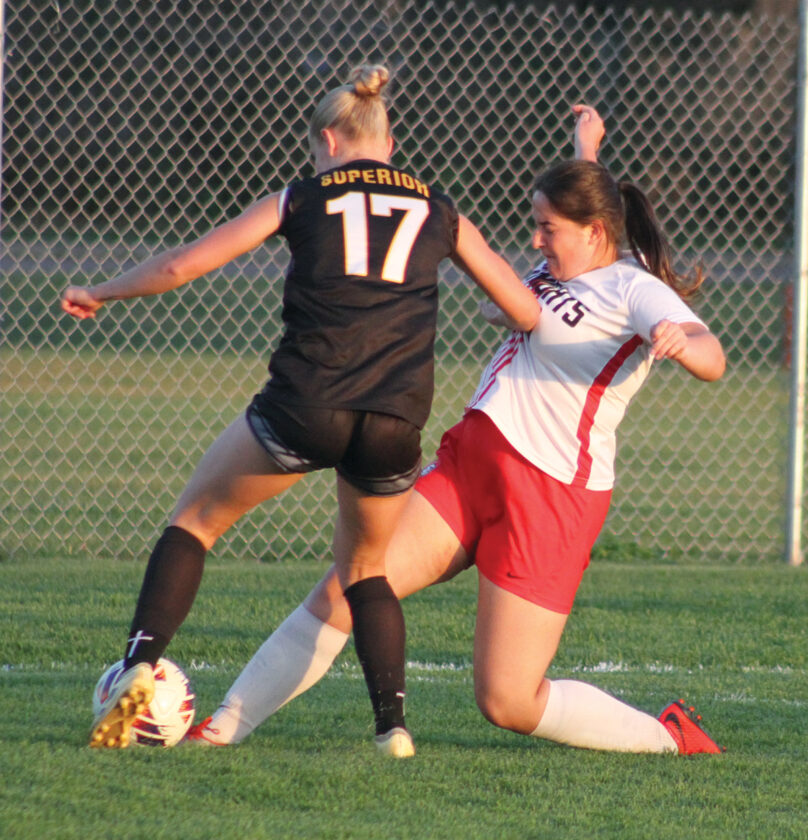 - Staff photo by Travis Rosenau Martin Luther College’s Cassondra Goeglein (38) makes a poke tackle to stop a potential shot by UW-Superior’s Kylee Soens (17) during a UMAC women’s soccer game on Friday evening at the MLC Soccer Pitch in New Ulm. The Knights fell 6-0.