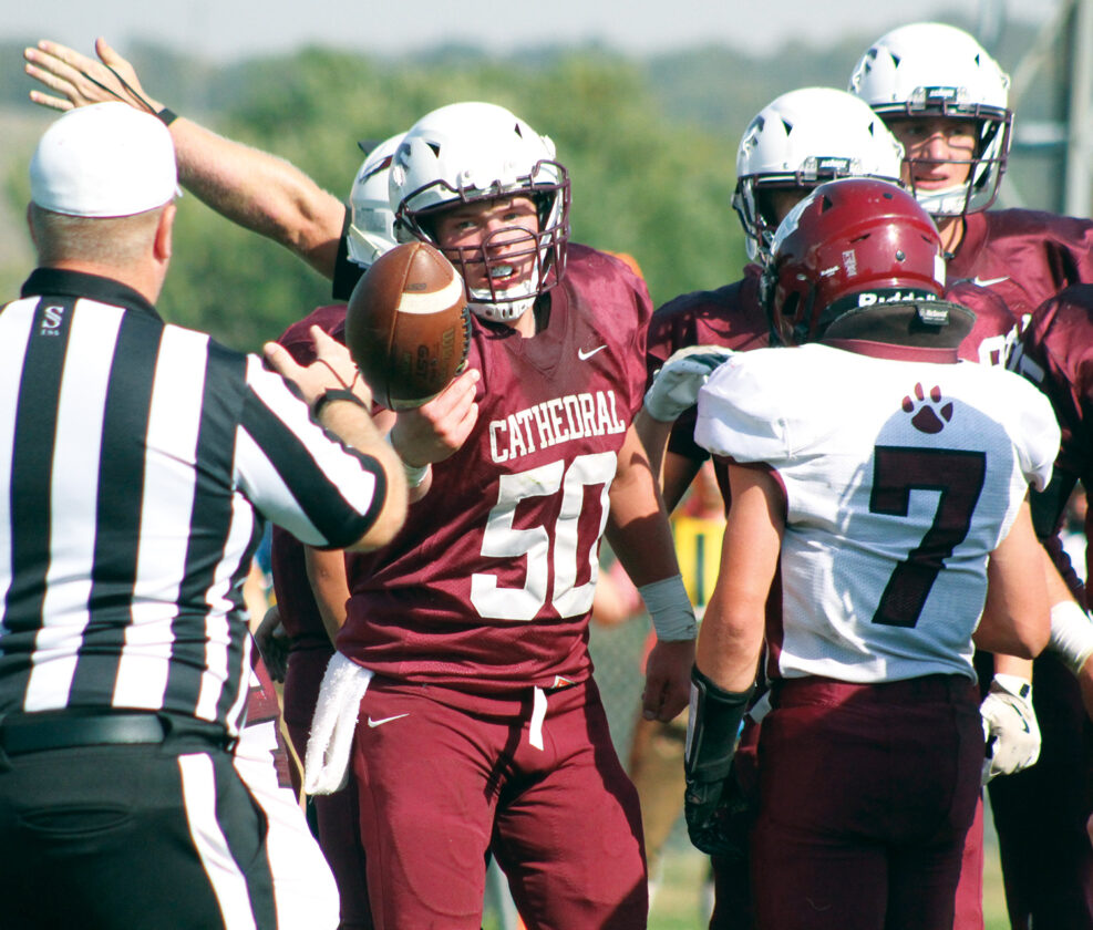 - Staff photo by Travis Rosenau New Ulm Cathedral’s Ike Kirschstein flips the ball to the official after recovering a fumble during the first half of Saturday afternoon’s nine-man football game against Mountain Lake Area at Johnson Field in New Ulm.
