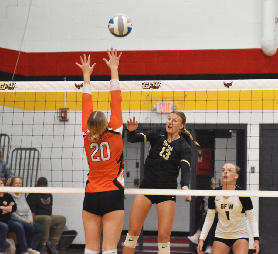 For GFW, Ella Nachreiner had 15 kills and three blocks, while Kora Schwarzrock had seven kills. Chloe Henrichs had 18 digs, Lauren Schafer had 13 digs and two aces, and Natalie Ahlbrecht had 13 set assists. Maren Kamkes added 12 set assists, and Kinley Bruns hand nine digs and an ace.