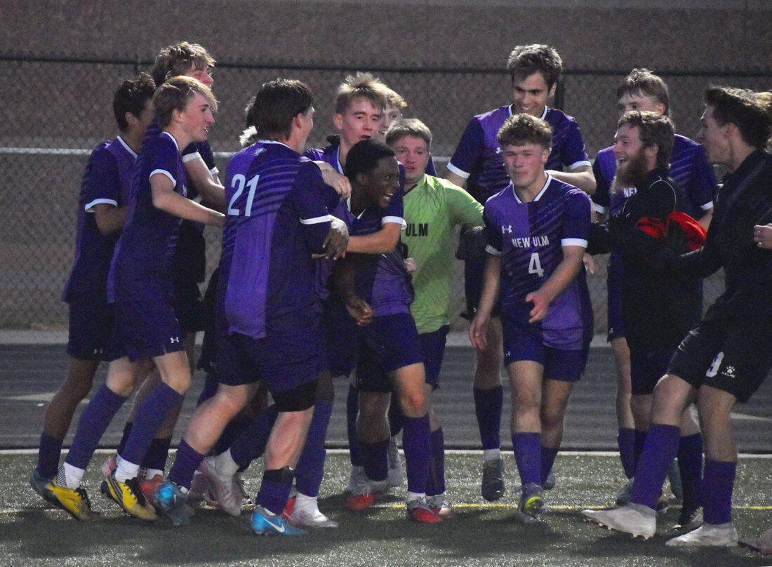 - Staff photo by Ari Selvey The New Ulm boys soccer team surrounds Methodious Amoah (center facing right) after he scored the game-winning goal over Mankato West in a Section 2AA boys soccer game Tuesday at New Ulm High School.