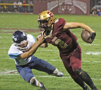 - Staff photo by Travis Rosenau Springfield’s Isaac Fredin tries to shed a tackle during Thursday night’s prep football game against RTR. Fredin finished with four catches for 94 yards and a touchdown.