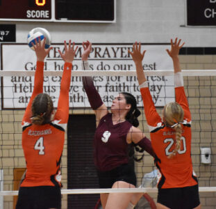 File photo by Ari Selvey New Ulm Cathedral’s Shay Wilfahrt (9) is defended by Madelia’s Carissa Sorenson (4) and Kellie Koberoski (20) during a nonconference volleyball match on Aug. 18 at Cathedral High School.