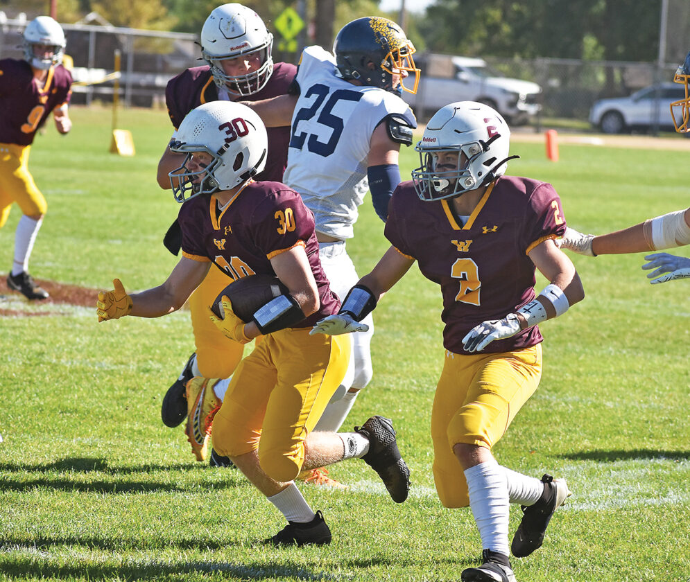 File photo by Ari Selvey Wabasso’s Nolan Leopold runs with the ball as Zach Skoblik (2) looks to block during the Rabbits’ Homecoming football game on Sept. 27 against Renville County West in Wabasso.
