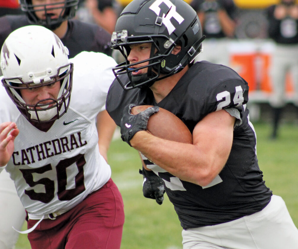 File photo by Travis Rosenau Red Rock Central’s Carter Therkilsen (24) runs the ball while chased by New Ulm Cathedral’s Ike Kirschstein (50) during the Section 2, Nine-Player Football Tournament semifinals in Lamberton on Oct. 25.