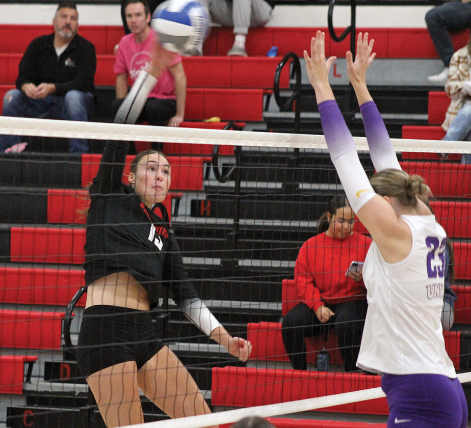 Staff photo by Travis Rosenau Martin Luther College’s Lydia Feidt attacks the ball during the Knights’ final volleyball game of the season during a UMAC match with the University of Northwestern on Saturday at MLC.