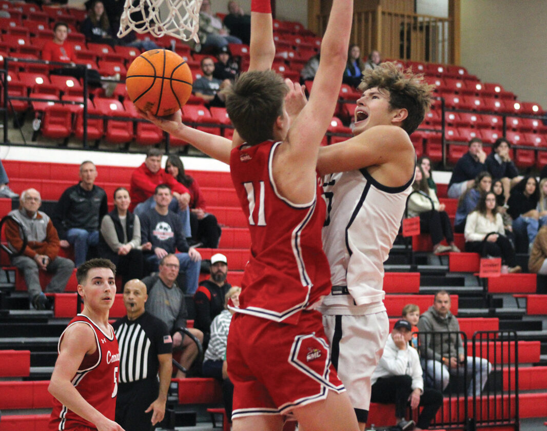 - Staff photo by Travis Rosenau Martin Luther College’s Ethan Kjenstad shoots the ball inside in traffic during a nonconference men’s basketball game against the University of Saint Mary’s on Tuesday at MLC.