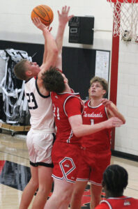 Staff photo by Travis Rosenau Martin Luther College’s Ethan Kjenstad shoots the ball inside in traffic during a nonconference men’s basketball game against the University of Saint Mary’s on Tuesday at MLC.