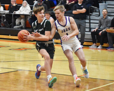- Staff photo by Ari Selvey Sleepy Eye St. Marys’ Adam Steffensmeier looks for driving room during a nonconference boys basketball game against Granada-Huntley-East Chain/Truman/Martin Luther Friday at Sleepy Eye High School.