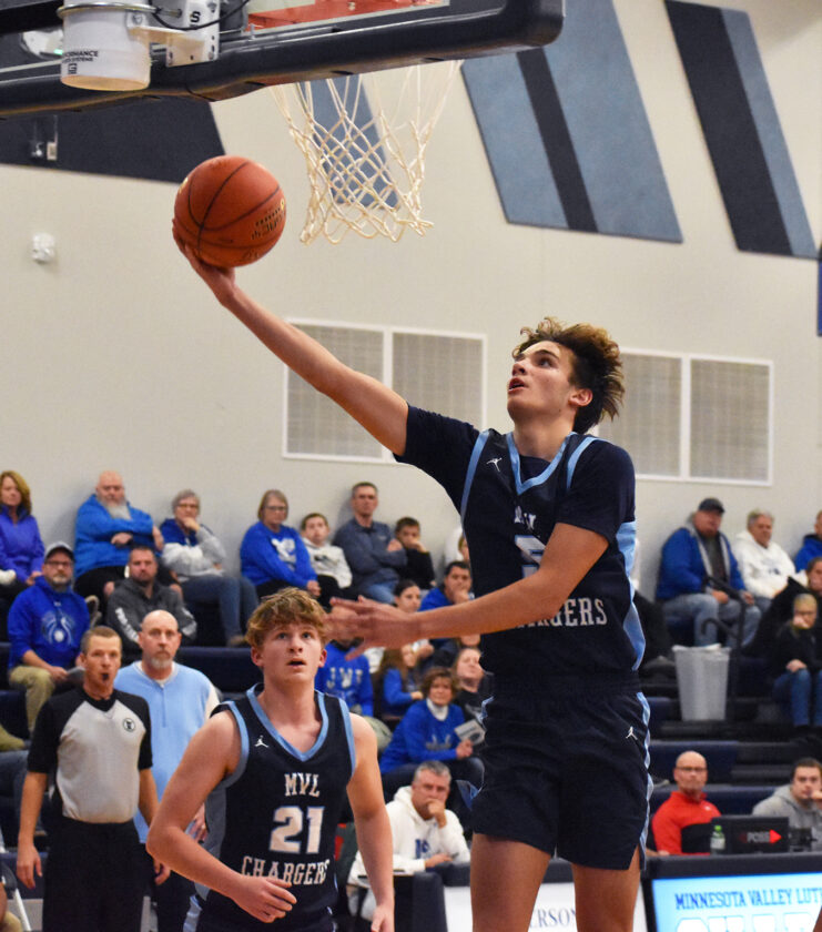 Staff photo by Ari Selvey Minnesota Valley Lutheran’s Pierson Brau puts up a layup during a nonconference boys basketball game against Janesville-Waldorf-Pemberton Monday at MVL High School.