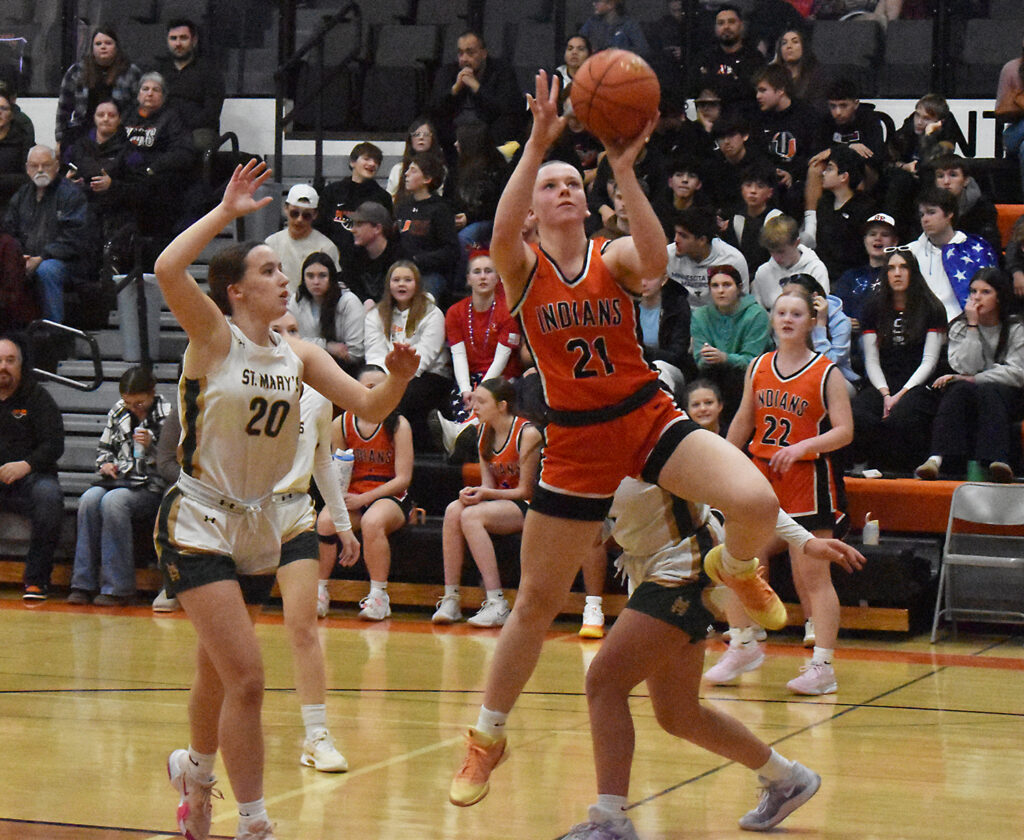 St. Mary’s came out of the timeout with a transition layup from Taylor Mathiowetz that sparked a 10-2 run, finished off by another transition layup from Morgan Mathiowetz. Taylor Berkner scored a layup to make it a 23-16 game, but St. Marys’ defense took over as the Knights shut out the Indians for the rest of the half.
