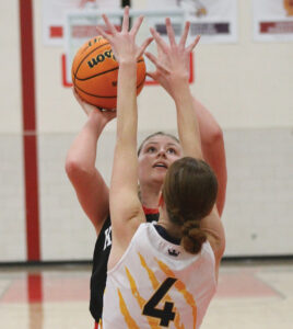 Staff photo by Travis Rosenau Martin Luther College’s Ella Hunter puts up a shot in the second half of Saturday’s nonconference women’s basketball game against Maranatha Baptist at MLC. Hunter finished the game with 8 points.