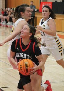 Morris continued her scoring with a 3 after a steal by Ava Walz opened the second quarter. An and-one by Heather Wendt followed to give the Knights a 33-11 lead before baskets inside by Wenz, Ava Walz and Chloe Koschnitzke were followed with another Morris 3 for a 42-11 advantage.