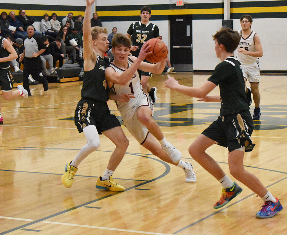 Cathedral struck back with a pair of 3-pointers by Collins to cut the lead to 18-13, but St. Mary’s pushed the lead out to 31-15 as Steffensmeier, Eli Christensen, Mathiowetz Isaac Christianson all scored.