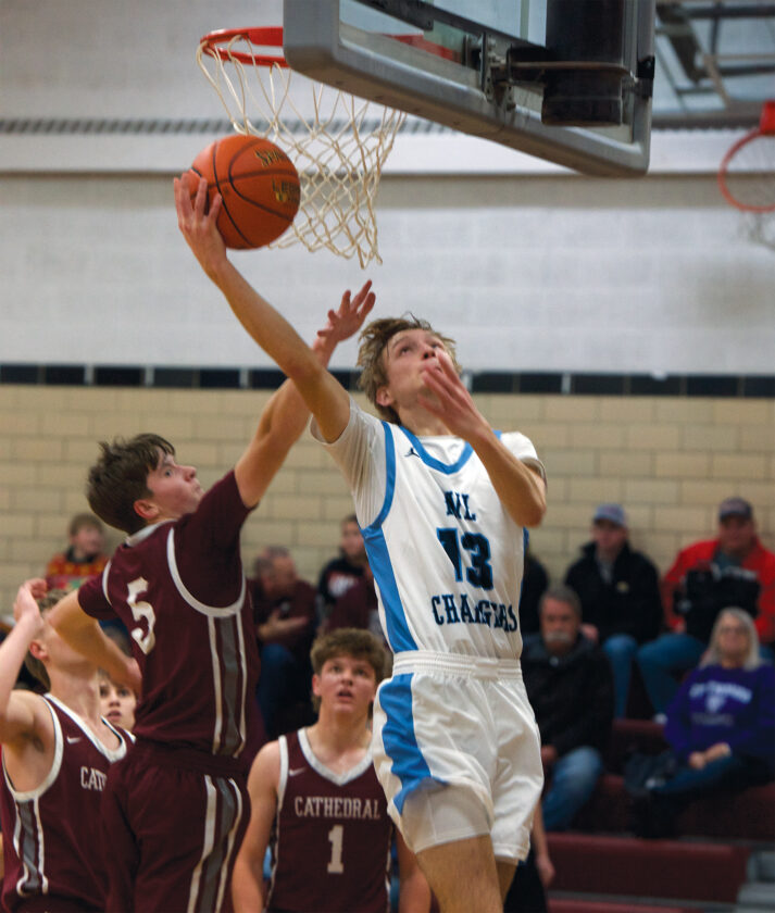 Photo by Brady Dennis Minnesota Valley Lutheran’s Trace Gunderson (13) goes up for a layup on Thursday in a nonconference boys basketball game against New Ulm Cathedral at Cathedral High School.