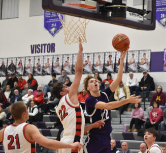 - Staff photo by Ari Selvey New Ulm’s Noah Mertz takes a layup during a Big South Conference boys basketball game against Belle Plaine Tuesday at New Ulm High School.