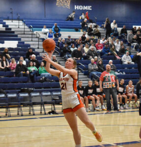 Staff photo by Ari Selvey Sleepy Eye’s Jaelynn Schauman takes a shot at the rim during a Tomahawk Division girls basketball game against Cedar Mountain at Cedar Mountain High School on Friday.