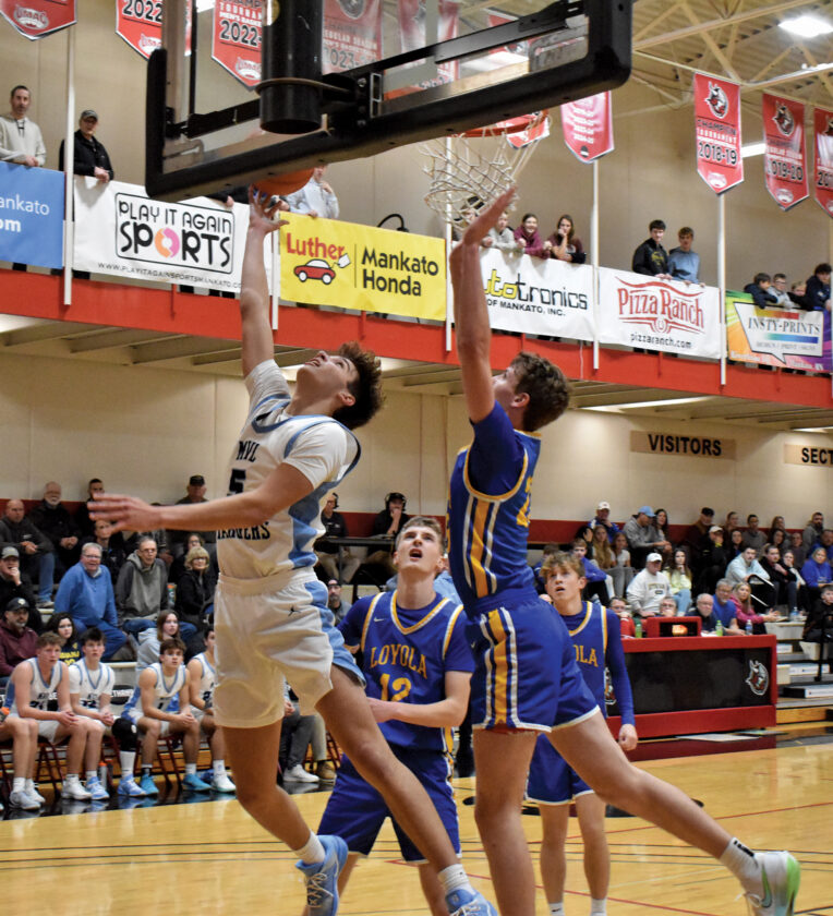Staff photo by Ari Selvey Minnesota Valley Lutheran’s Pierson Brau puts up a reverse layup during a Kwik Trip Holiday Boys Basketball Tournament game against Mankato Loyola on Friday at Bethany Lutheran College.