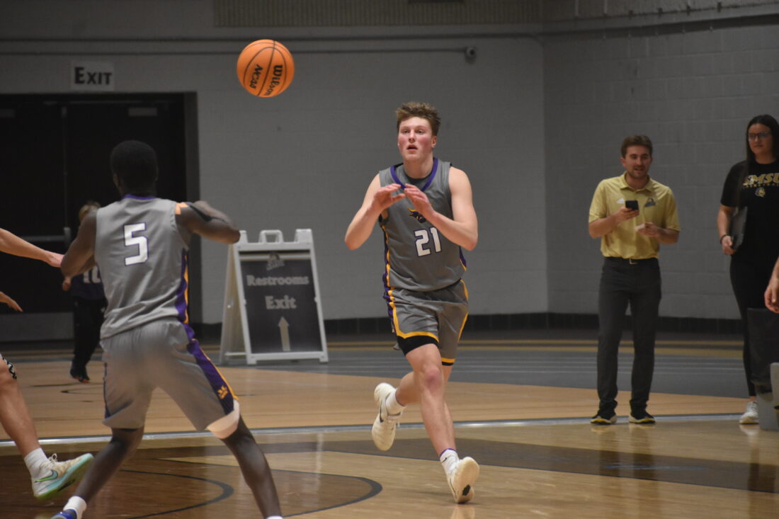 Photo by Samantha Davis Minnesota State University redshirt freshman Colton Benson receives a pass from a teammate during a Northern Sun Intercollegiate Conference men’s basketball game against Southwest Minnesota State University on Dec. at the R/A Fa- cility in Marshall. Benson started the game and finished with 12 points and five rebounds for the Mavericks in the 78-66 loss to th Mustangs.