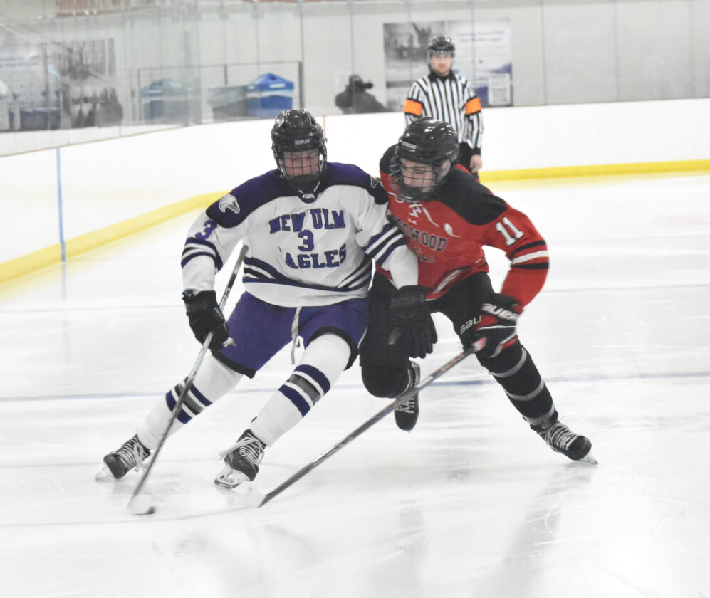 NEW ULM — In Saturday night’s Big South Conference boys hockey game against Redwood Valley, the New Ulm Eagles had as many goals in the game as the Cardinals had shots on goal.