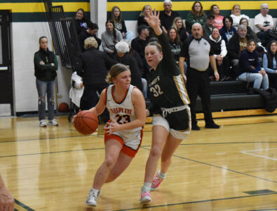 - Staff photo by Ari Selvey Sleepy Eye’s Jace Schauman (23) drives the baseline against Sleepy Eye St. Marys’ Sydney Tauer (32) during a Tomahawk Division girls basketball game at St. Mary’s HIgh School.