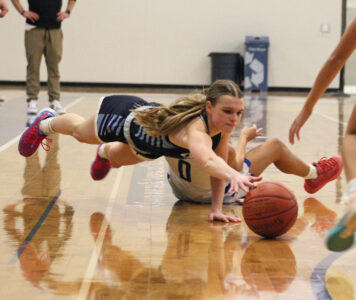 - Staff photo by Travis Rosenau Minnesota Valley Lutheran’s Avery Freier dives for the ball during the second half of Saturday’s nonconference girls basketball game against Waseca.