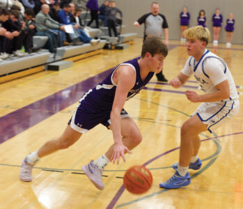 Photo by Brady Dennis New Ulm’s Levi Hopp dribbles the ball while Waseca’s Brody Dufault defends during a Big South Conference boys basketball game on Friday night at New Ulm High School.