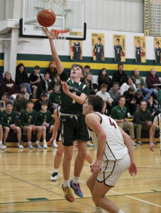 Staff photo by Travis Rosenau Sleepy Eye St. Marys’ Cooper Walter scores on a layup in the second half of a Tomahawk Division boys basketball game against Springfield on Thursday night at St. Mary’s High School. Walter finished with six 3-pointers and 22 points.