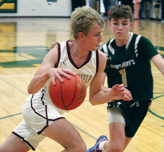 - Staff photo by Travis Rosenau Springfield’s Dylan Simonson dribbles to the hoop while guarded by Sleepy Eye St. Marys’ Cooper Walter (1) of a Tomahawk Division boys basketball game on Thursday night at St. Mary’s High School.
