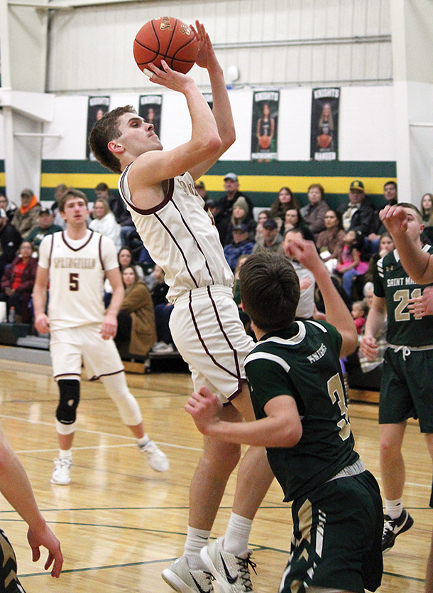 - Staff photo by Travis Rosenau Springfield’s Madden Lendt puts up a fadeaway shot in the paint during a Tomahawk Division boys basketball game against Sleepy Eye St. Mary’s on Thursday night at St. Mary’s High School. Lendt had 13 points and 18 rebounds.