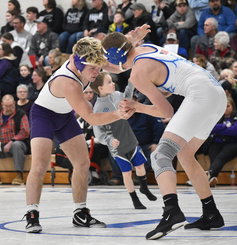 - Staff photo by Ari Selvey New Ulm Area’s Tegan Kral works for position against Lake Crystal Wellcome Memorial Area’s Levi Gilman at 145 during a nonconference prep wrestling match Tuesday at Nicollet High School.