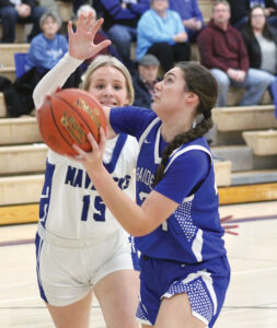 Staff photo by Travis Rosenau Nicollet’s Cheyenne Klockziem goes up for a shot in the paint while guarded by Martin County West’s Bailey Larson (15) during a Valley Division girls basketball game at Nicollet High School on Friday evening.